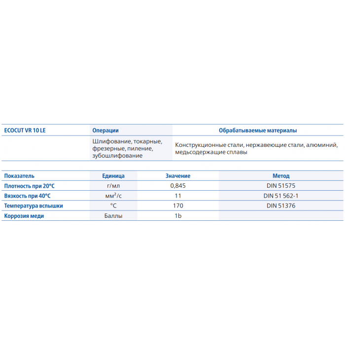 ECOCUT VR 10 LЕ - СОЖ для шлифования и лезвийной обработки широкого перечня материалов. В основе ECOCUT VR 10 LE лежит комбинация высококачественных базовых масел произведенных по технологии гидрокрекинга и специально подобранных функциональных присадок, повышающих стабильность к окислению, антикоррозионную защиту и смазывающую способность продукта. Базовые компоненты ECOCUT VR 10 LE обеспечивают низкую испаряемость и туманообразование, что ведет к увеличению чистоты рабочих мест и улучшению условий труда, а также повышает пожаробезопасность продукта.